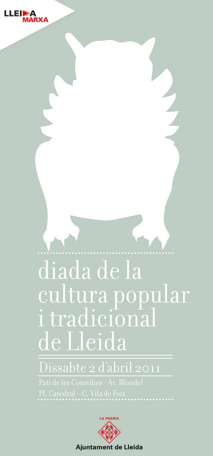 Aquest dissabte Diada de la Cultura Popular i Tradicional de Lleida, estarem des de les 10h fins a les 13h i també de 17h fins a les 20h al Carrer Major, al costat de la Catedral Nova, i devant del Institut d'Estudis Ilerdencs. En aquesta paradeta nostra, tindrem expossada l'Àliga de Lleida en commemoració del seu 10è Aniversari, aquí us podreu informar sobre el que hi farem al Xè Aniversari de l'Àliga de Lleida, saber més sobre nosaltres, també us podreu fer socis, informar-vos de les activitats que fem durant tot l'any i moltes més coses sobre nosaltres.